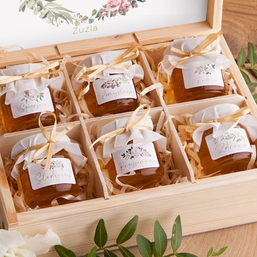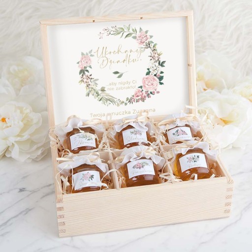 - skład: zestaw na podziękowanie dla Chrzestnych oraz Dziadków umieszczony w skrzyni wykonanej z naturalnego jasnego drewna; w środku znajduje się 6 przegródek - w każdej z nich został umieszczony malutki słoiczek ze słodkim miodkiem z polskiej pasieki udekorowany materiałem w jasnym kolorze i przewiązany wstążeczką; w środku znajduje się również personalizowana karteczka z grafiką w rustykalnym stylu i tekstem życzeń; zestaw do wyboru dla Babci i Dziadka lub Dziadków razem oraz dla Matki i Ojca Chrzestnego