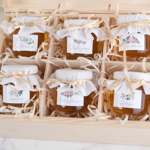 Podziękowanie na Chrzest i Komunię z miodami to wspaniała propozycja, która wyrazi wdzięczność i podziękuje za przybycie na uroczystość Komunii lub Chrztu. W drewnianej skrzyni znalazły się zdrowe polskie miody wielokwiatowe, które zostały udekorowane materiałem i naklejką. Całość posiada spersonalizowane życzenia oraz piękną kwiatową grafikę w rustykalnym stylu.