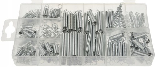 Zestaw sprężynek zawierający 200 różnych rozmiarów. Sprężynki pracujące zarówno na ściskanie, jak i rozciąganie. Całość umieszczono w wygodnym opakowaniu typu "sortownik".