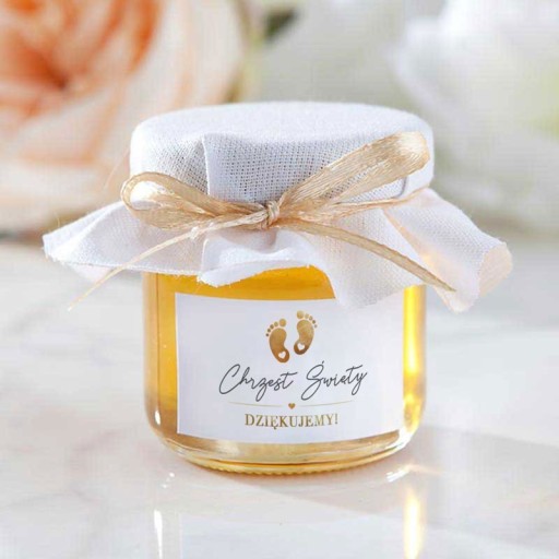 - skład: przepyszny słodziutki miodek w szklanym słoiczku, elegancko dekorowany materiałem oraz złotą tasiemką, miodek udekorowany jest także naklejką z matowym motywem dziecięcych stópek, napisem Chrzest Święty oraz Dziękujemy