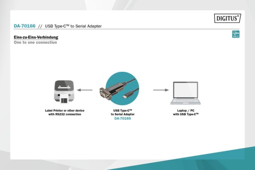Adapter szeregowy USB Type-C™ marki DIGITUS® to praktyczne rozwiązanie do połączeń szeregowych. Szeregowe złącze RS232 nie jest już dostępny na nowszym sprzęcie komputerowym, a adapter szeregowy USB Type-C™ marki DIGITUS® umożliwia wymianę danych pomiędzy portem USB Type-C™ komputera a urządzeniami peryferyjnymi ze złączem szeregowym (port COM, RS232), takimi jak np. stacje pogodowe, czujniki, systemy sterowania maszyn, dekoder STB, konsole do gier, palmtopy, skanery, modemy, adaptery ISDN i wiele innych urządzeń peryferyjnych. Szeregowy adapter USB Type-C™ jest kompatybilny w dół do USB 1.1 i umożliwia dostosowanie prędkości transmisji pomiędzy 75 bitów a 128 000 bitów na sekundę. Dzięki indywidualnie konfigurowalnemu chipsetowi FTDI zapewniona jest kompatybilność wszystkich standardowych systemów operacyjnych, a także zarządzanie zarządzanie energią (power-management) i zdalne wybudzanie z trybu oszczędzania energii (remote-wake-up). Zasilanie następuje przez złącze USB, nie ma potrzeby stosowania odrębnego zasilacza