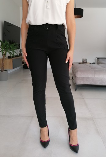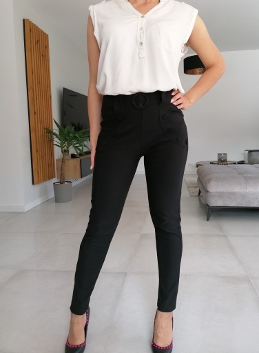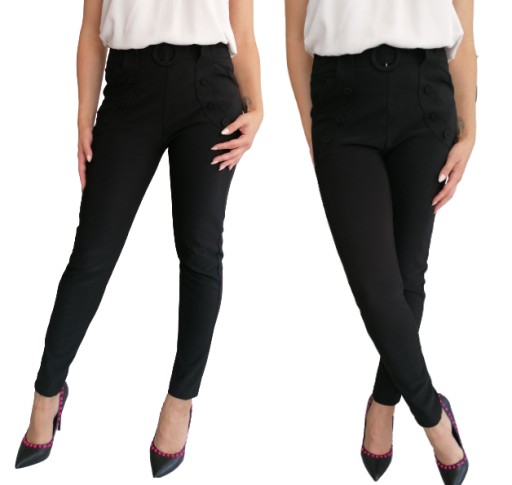 Najmodniejsze spodnie, dzięki którym stworzysz niepowtarzalny, elegancki outfit. Długa nogawka idealna na każdą porę roku. Lekko dopasowany, elastyczny fason z wysokim stanem perfekcyjnie podkreśli Twoją figurę. Na wysokości bioder posiada dwie poręczne kieszenie. Dzięki gumce w pasie będziesz czuć się komfortowo. Dodatkowo w pasie imitacja paska oraz ozdobne guziki na wysokości kieszeni.