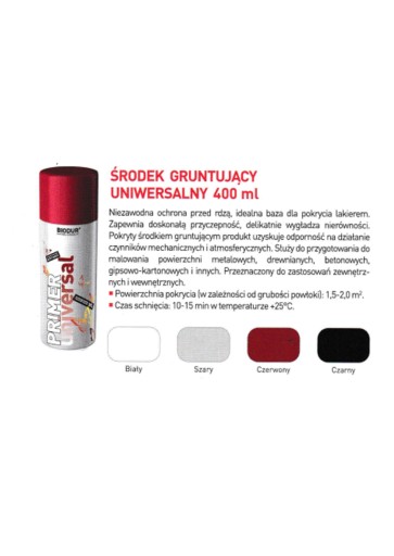 Farba podkładowa, doskonale poprawiająca przyczepność. Zabezpiecza przed korozją. Przeznaczona do gruntowania powierzchni: drewna, metalu, betonu, kamienia, szkła, tworzyw sztucznych. Szerokie zastosowanie w motoryzacji i przemyśle, ogrodzie, pracach artystycznych, dekoracyjnych, hobbystycznych jak i profesjonalnych w domu.