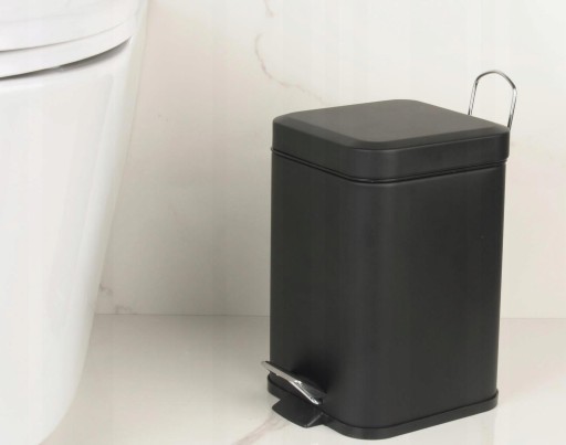 - kosz na śmieci z klapą (3l), z wygodnym pedałem dzięki, któremu możemy otworzyć pokrywę bez używania rąk. Wewnątrz kosza znajduje się czarny, plastikowy pojemnik, który posiada praktyczną rączkę, dzięki której łatwiej jest go opróżnić. Podstawa całego produktu wykonana jest z tworzywa sztucznego, które nie porysuje powierzchni podłogi w łazience czy toalecie. Z tyłu znajduje się ruchomy, metalowy uchwyt do przenoszenia lub zawieszenia kosza.