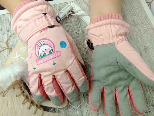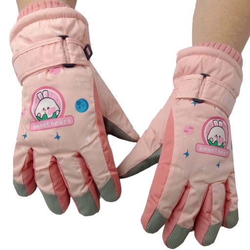 Piękne, ciepłe, pięciopalczaste rękawiczki dziecięce z motywem królika. Od wewnątrz wypełnione milutkim misiem. Od spodu rękawiczek warstwa gumowa ułatwiająca chwytanie. Posiadają ściągacz zabezpieczający oraz zapięcie na rzep. Rękawiczki można spiąć razem.