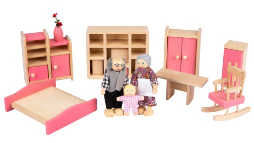Zestaw drewnianych mebelków będą nie tylko praktycznym dodatkiem do domku dla lalek, ale i jego ozdobą. Zaprojektuj wolną przestrzeń. Ustawiaj, przestawiaj mebelki według własnych upodobań. W zestawie również znajdują się trzy laleczki: babcia, dziadek i dziecko.
