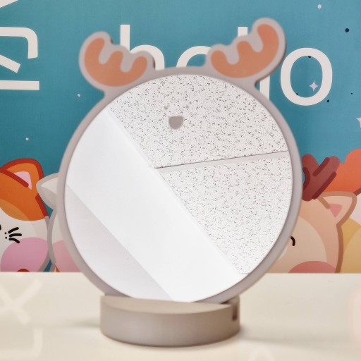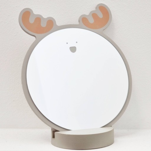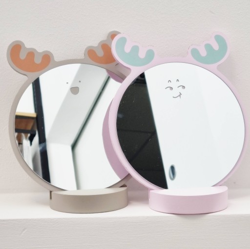 Fajne drewniane lusterko okrągłe z rogami jelonka idealne zarówno do postawienia w pokoju dziewczynki, salonie, w sypialni czy łazience.
