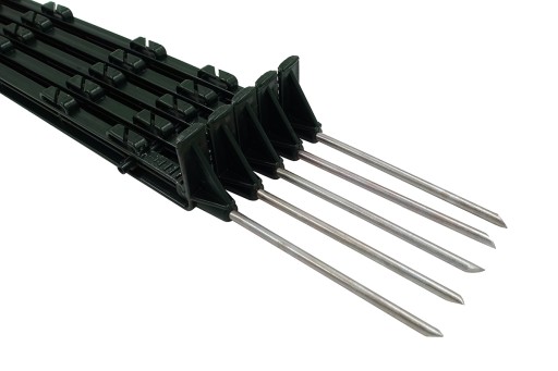 - słupki posiadają zaczepy blokujące drut, plecionki i taśmy o szerokości do 20 mm