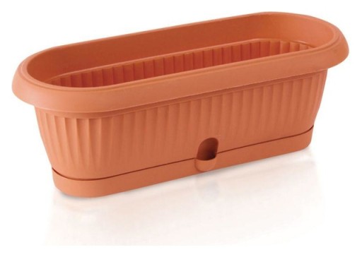 Doniczka Terra DCK Prosperplast to podłużna, klasyczna skrzynka balkonowa z subtelnym ornamentem, zwana również kaktusiarką, w zestawie z podstawką ze specjalnym otworem, który ułatwia podlewanie roślin.