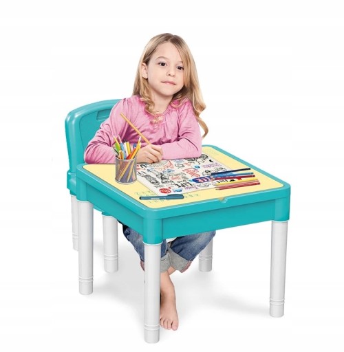 Wielofunkcyjny zestaw krzesełko plus stolik z planszą do popularnych klocków oraz schowkiem i czterema pojemnikami