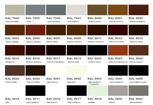 Prosimy nie traktować poniższych próbek jako drukowanego wzornika RAL. Wzornik RAL przedstawiony poniżej jest standardowym ogólnodostępnym wzornikiem wykorzystywanym przez producentów farb. Istnieje możliwość porównania wybranego koloru np. w wyszukiwarkach internetowych.