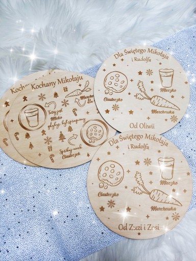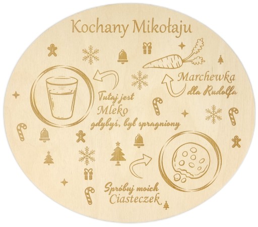 Drewniany talerzyk z miejscem na postawienie mleczka i położenie ciasteczka dla Św. Mikołaja w dwóch wersjach do wyboru.