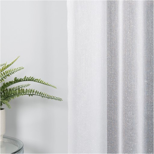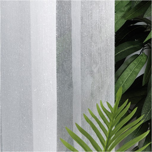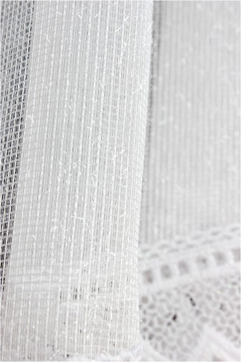 Firana z materiału fantazyjnego anielski włos. Podkład z której uszyta jest firana składa się z siateczki pokrytej wystającymi włoskami połyskującymi pod różnym kątem. Firana dobrze przepuszcza światło oraz powietrze. Góra firanki jest wykończona wypustką zasłaniającą żabki, dół wycięty w łuk wykończony grubą nowoczesną gipiura opalizującą z wplecioną srebrną nicią.