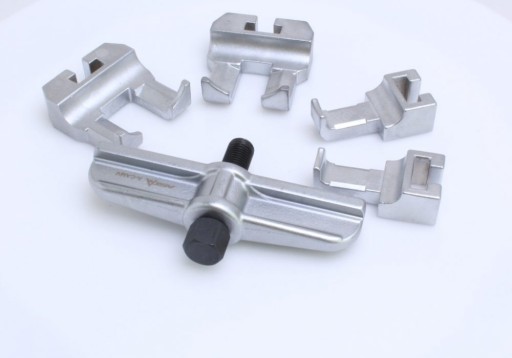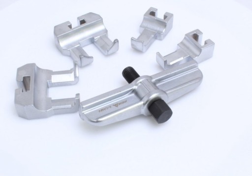Specjalnie skonstruowane krótkie łapy ściągacza pozwalają na bezproblemowy demontaż kół pasowych z wałka rozrządu występujących w silnikach benzynowych 6- i 8-cylindrowych VW/Skoda/Audi.