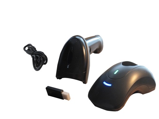 albo używając bazę ładująco-komunikacyjną która równie dobrze może służyć jako stojak pod skaner.