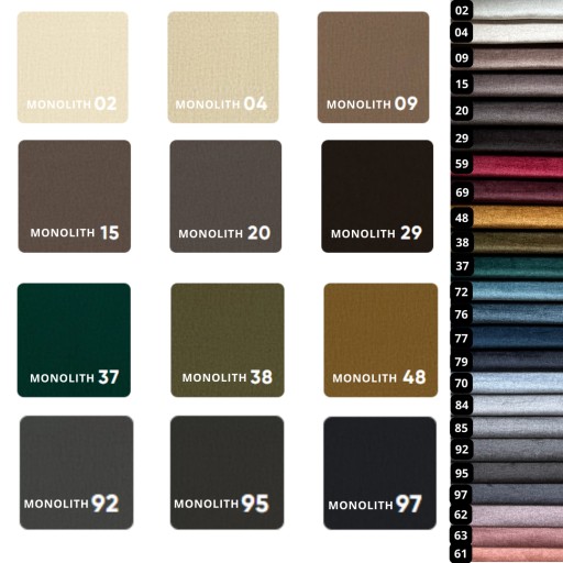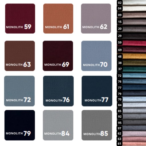 TKANINA MONOLITH - Tkanina Monolith to mocny i jednocześnie miły w dotyku materiał obiciowy. Wzbogacony specjalną powłoką hybrydową, która zabezpiecza przed wnikaniem cieczy w strukturę tkaniny. Ten ładny i wytrzymały materiał świetnie sprawdzi się w każdym domu oraz w lokalach użytku publicznego. To również świetna tkanina dla dzieci i materiał odporny na zwierzęta.