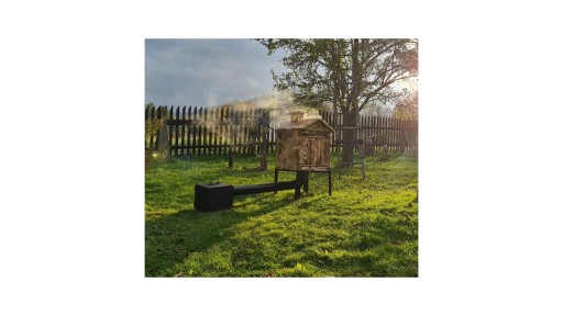 - Dach drewniany w komplecie z kominkiem ODCHYLANY na zawiasach - zawiasy są przykręcone już do komory, łańcuszek zabezpiecza nadmierne odchylenie dachu w dachu wywiercony otwór dzięki któremu dym swobodnie się wydobywa)
