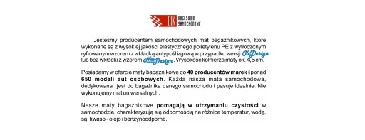Mata bagażnika pomaga w utrzymaniu czystości w samochodzie: odporna na wodę, brud i różnego rodzaju oleje oraz paliwa. Dzięki temu, że jest elastyczna wkładanie i wyjmowanie jest bardzo proste, a przez to nie ogranicza dostępu do schowka pod podłogą lub koła zapasowego.