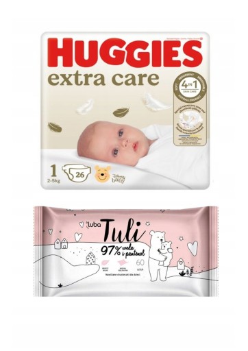 PIELUSZKI HUGGIES extra care, 26 szt. dedykowane specjalnie dla noworodków, rozmiar 1, 2-5 kg. Hipoalergiczne, zostały wykonane z myślą o szczególnie delikatnej skórze noworodka. Wysoka jakość użytych materiałów zapewni odpowiednią cyrkulację powietrza i pozwoli skórze oddychać.Już od pierwszych chwil pupa Twojej pociechy będzie otoczona wyjątkową ochroną dzięki miękkim poduszeczkom, które zapewnią barierę między zawartością pieluszki, a skórą dziecka. Unikalna warstwa chłonna Soft Absorb w kilka chwil wchłonie nie tylko mocz, ale także płynny stolec. Każda pieluszka została wyposażona w elastyczny pasek, aby zapewnić maksimum komfortu i idealne dopasowanie.Pieluchy Huggies zostały wyposażone w wewnętrzną kieszeń oraz podwyższone boki, aby zapewnić ochronę przed przeciekami. Wskaźnik wilgoci, dzięki któremu bez otwierania pieluszki sprawdzisz, czy nadszedł już czas na jej zmianę. Kiedy dziecko odda mocz, żółty paseczek zabarwi się na niebiesko. Na każdej pieluszce znajdziesz słodkiego Kubusia Puchatka.