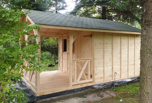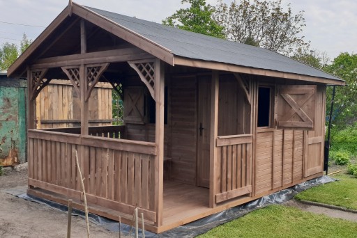 - Konstrukcja drewniana domku z tarasem wykonana z suszonej komorowo sosny