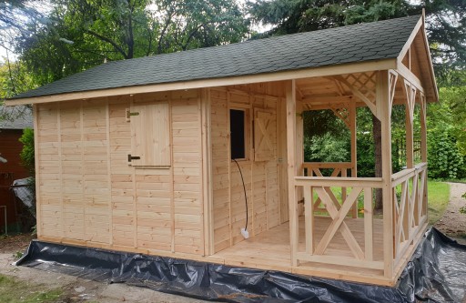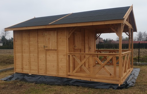 Domek drewniany z tarasem o podstawie 5x3 m. Powierzchnia do zamieszkania 3x3 m, natomiast taras 2x3 m. Znakomicie nadaje się do zastosowań na działkach rekreacyjnych jak i w ogrodach przydomowych. Ściany wykonane w technologii węgłowej pióro-wpust o grubości 19 mm. Grubość legarów pod podłogą 5x5 cm. Domek wykonany jest z drewna sosnowego suszonego komorowo do wilgotności 15%. Suszenie zapewnia ochronę przed sinizną i grzybami. Te kryteria mają istotny wpływ i zapewniają długoterminową trwałość naszego produktu. Podłoga i dach w zestawie- domek w pełni odeskowany. Konstrukcja domku umożliwia ocieplenie od wewnątrz.