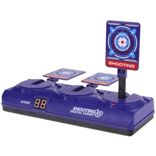 To doskonała zabawka, która pozwoli dziecku stać się strzelcem wyborowym. Oprócz treningu celnego strzelania, tarcza pomoże dzieciom w nabyciu zręczność oraz rozwoju prawidłowej koordynacji wzrokowo-ruchowej. Celem gry jest trafienie w trzy zamieszone na podeście punkty. Przy każdym celnym trafieniu usłyszymy dźwięk oraz zostaną naliczone nam punkty za celny strzał, które możemy kontrolować na wyświetlaczu. Po strąceniu wszystkich trzech punktów, tarcze podniosą się automatycznie do góry, aby znów można było prowadzić trening lub rywalizować z innymi rówieśnikami o tytuł najlepszego strzelca.