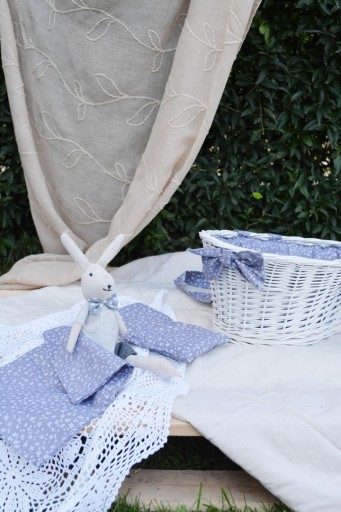 Wszystkie elementy szyte są ze 100% bawełny. W naszej kolekcji używamy materiałów dobrej jakości w czterech wzorach kolorystycznych: ecru, szara łączka, biała łączka, granatowa łączka.