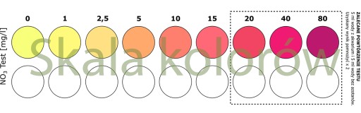 Wyniki powyżej 20 mg/l bez rozcieńczeń zalecamy traktować SZACUNKOWO a nie jako precyzyjny pomiar. Dotyczy to wszelkich testów na rynku (nawet u nas w laboratorium gdy badamy azotany aparaturą, musimy rozcieńczać próbki). W przypadku bardzo wysokich stężeń można rozcieńczać mocniej (np. 2 ml wody badanej i 8 ml bez azotanów, następnie uzyskany wynik x 5).
