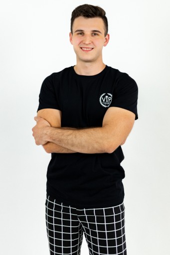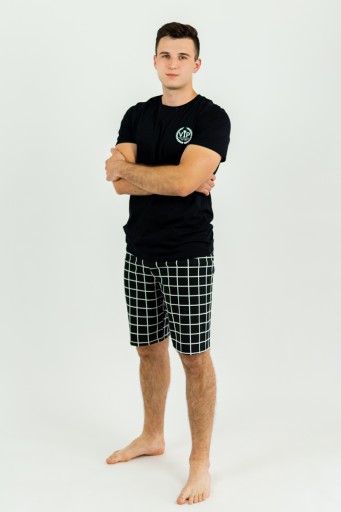 Piżama męska Vip to bawełniany komplet klasycznej czarnej koszulki z nadrukiem oraz spodenek w modną kratę. Komfort zapewni krój oraz bawełniany materiał z którego stworzyliśmy piżamę. Idealny wybór dla Panów, którzy lubią klasykę okazaną w modnym stylu!