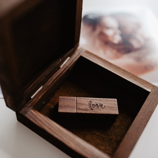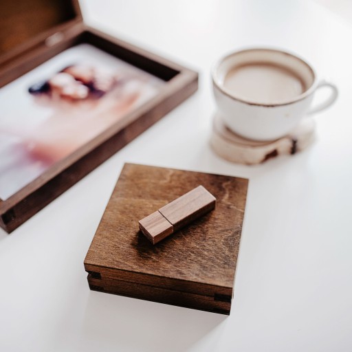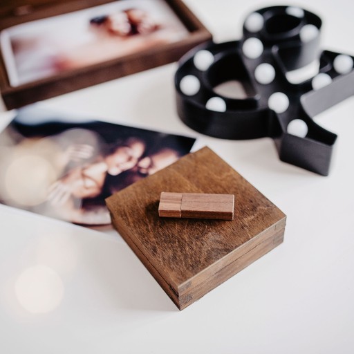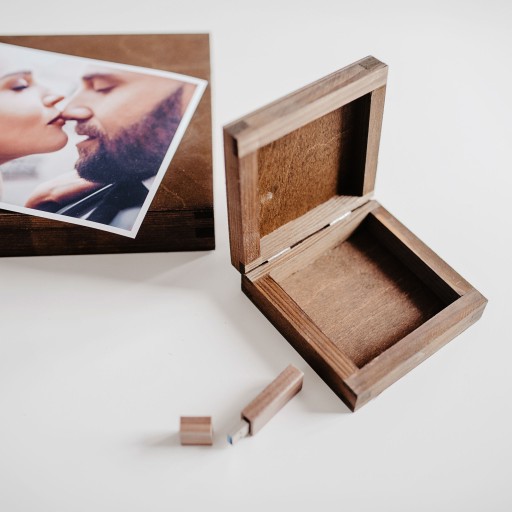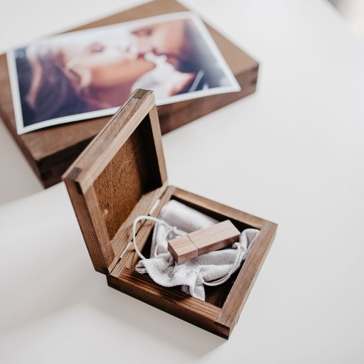 Eleganckie drewniane opakowanie na pendrive. Na zawiasach.