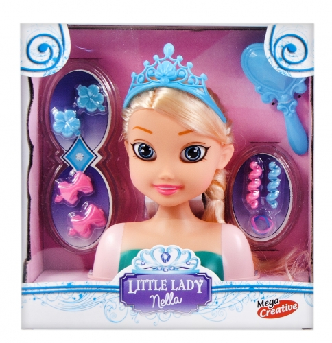 Zestaw do stylizacji zawiera 11 elementó głowę lalki z bujnymi blond włosami, koronę, lusterko, gumki, spinki oraz ozdoby.