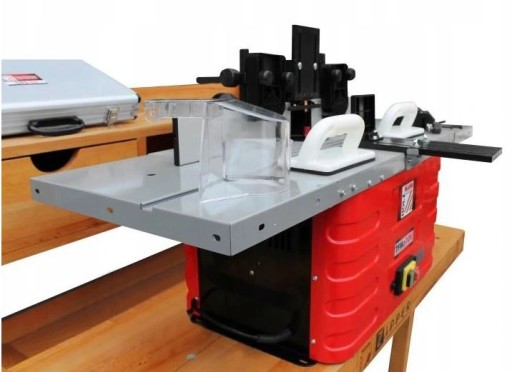 - Zawarte w dostawie: tuleje zaciskowe fi 6, 8 i 12 mm, 2-krotne przedłużenie stołu (z obu stron), podziałka kątowa, ogranicznik z aluminium, popychacz