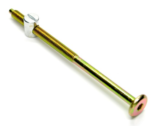 Opis: złącze wykorzystywane jest do skręcania mebli domowych, ogrodowych. Złącze tego typu gwarantuje połączenie o dużej wytrzymałości, jak również daje możliwość łatwego montażu i demontażu. Śruba M6 wykonana jest w ocynku złotym, łeb śruby przystosowany jest do klucza imbusowego nr 4 (inne określenie HEX 4). Nakrętka M6 x 13 x 10 wykonana jest w ocynku białym.