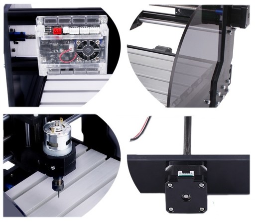 - Bardziej stabilna i sztywna konstrukcja w porównaniu do standardowej CNC 3018 dzięki zastosowaniu profilu o dwa razy większym przekroju oraz mocowań łożysk, śrub, wałków bezpośrednio w ramie