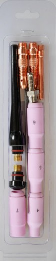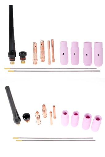 Oprócz uchwytu, butli z Argonem (+przewód gazowy+opaski+reduktor), proponujemy Ci 2 kompletne, uniwersalne zestawy akcesoriów do spawania elektrodą o średnicy 1,6mm oraz 2,4mm. W skład zestawu wchodzi: elektroda, tulejka zaciskowa, łącznik prądowy, 4 dysze gazowe-ceramiczne, 2 korki (długi i krótki).