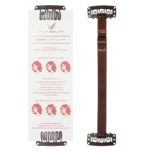 Spinki do ekspresowego liftingu twarzy. Doskonale sprawdzają się podczas specjalnych okazji oraz sesji zdjęciowych. Stanowią rozwiązanie, dzięki któremu w szybki i nieinwazyjny sposób można wyglądać pięknie i młodo. Produkt jest niezwykle prosty w użyciu, wystarczy przypiąć spinki na skroniach i naciągnąć opaskę.