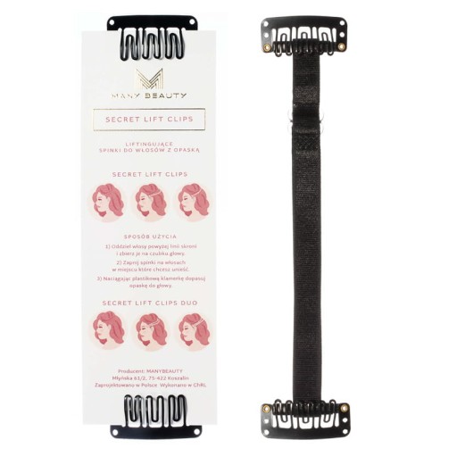Spinki do ekspresowego liftingu twarzy. Doskonale sprawdzają się podczas specjalnych okazji oraz sesji zdjęciowych. Stanowią rozwiązanie, dzięki któremu w szybki i nieinwazyjny sposób można wyglądać pięknie i młodo. Produkt jest niezwykle prosty w użyciu, wystarczy przypiąć spinki na skroniach i naciągnąć opaskę.
