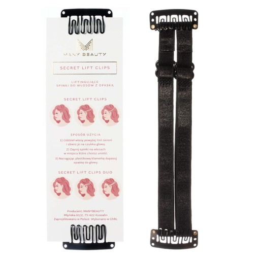 Spinki do ekspresowego liftingu twarzy. Doskonale sprawdzają się podczas specjalnych okazji oraz sesji zdjęciowych. Stanowią rozwiązanie, dzięki któremu w szybki i nieinwazyjny sposób można wyglądać pięknie i młodo. Produkt jest niezwykle prosty w użyciu, wystarczy przypiąć spinki na skroniach i naciągnąć opaskę.