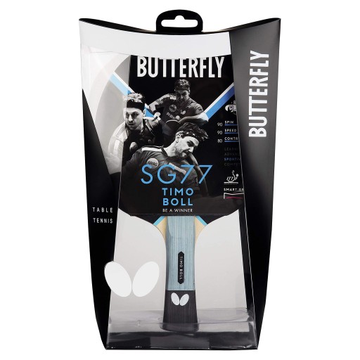 Topowa treningowa rakietka Butterfly TIMO BOLL SG77 przeznaczona dla zaawansowanych technicznie i taktycznie graczy. Guma Pan Asia z gąbką 1,8 mm zapewnia doskonałe czucie piłeczki. Innowacyjna rączka (o nietypowym kształcie) umożliwia pewniejszy chwyt i lepsze dopasowanie rakietki do dłoni.