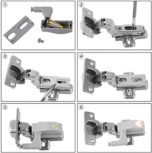 Nakładana na zawias lampka jest bardzo prosta w montażu i pasuje do większości klasycznych zawiasów meblowych.