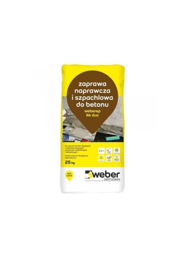 weberep R4 duo przeznaczony jest do naprawy i reprofilacji podłoży betonowych i żelbetowych. Może być stosowany do napraw i wypełnień ubytków elementow betonowych i zelbetowych, takich jak np. belki, słupy, płyty balkonowe, schody, posadzki, itp. Maksymalna grubość w jednym cyklu roboczym to 50 mm. Dzięki drobnemu uziarnieniu może być stosowana także jako szpachlówka do wyrównania i egalizacji podłoży betonowych. Minimalna grubość warstwy to 1 mm. Jako szpachlówka materiał moze być stosowany pod powłoki ochronne, impregnację hydrofobizującą lub systemy posadzkowe na baże żywic.