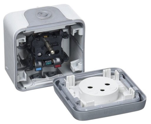 Kompletne gniazdo natynkowe. Seria Plexo przeznaczona jest do instalacji na zewnątrz lub w pomieszczeniach wilgotnych - piwnicach, garażach, restauracjach, barach. Klasa wodoszczelności IP55 gwarantuje bardzo wysoki poziom ochrony - między innymi przed wnikaniem wody lanej strugą czy przed pyłem.