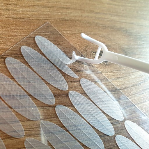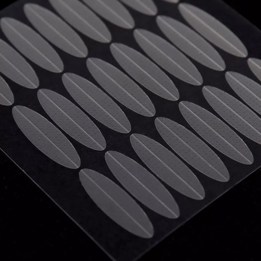 Samoprzylepne tasiemki do podklejania powiek korygujące opadające powieki. Dzięki materiałowi z którego zostały wyprodukowane (elastyczna medyczna guma) załamanie można układać w dowolny sposób