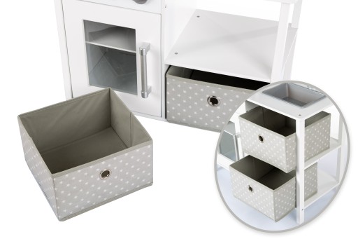 Kuchnia wyposażona w wyciągane kosze. Przechowywanie zabawek, czyli porządek w pokoju dziecka. Zestaw zawiera dwa kosze.