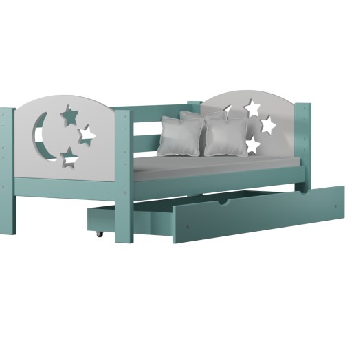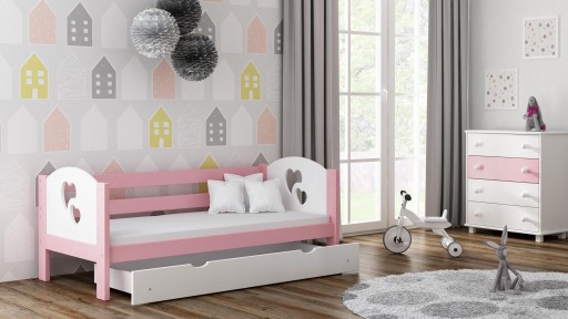 Łóżko WRÓBEL-F3 wykonane jest z wysokiej jakości drewna sosnowego z wstawką z płyty meblowej w zagłówkach. Wzór w serca lub gwiazdki, wycięty w łukowatych zagłówkach, nadaje całej konstrukcji lekkości i delikatności, a długa boczna barierka pełni funkcję ochronną.