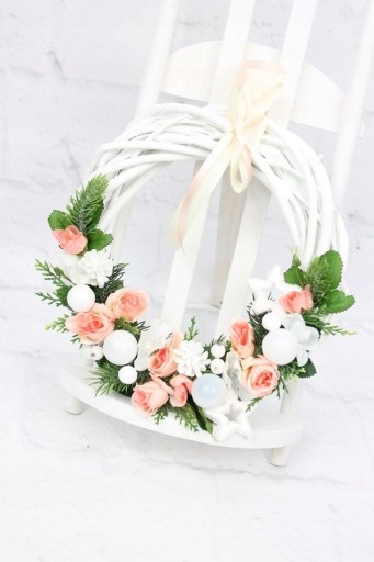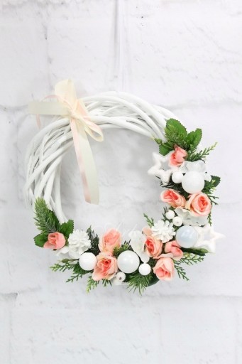 Wianek świąteczny zimowy o średnicy 25cm udekorowany kwiatami i pąkami róży oraz hortensji w odcieniu kremowo różowym.