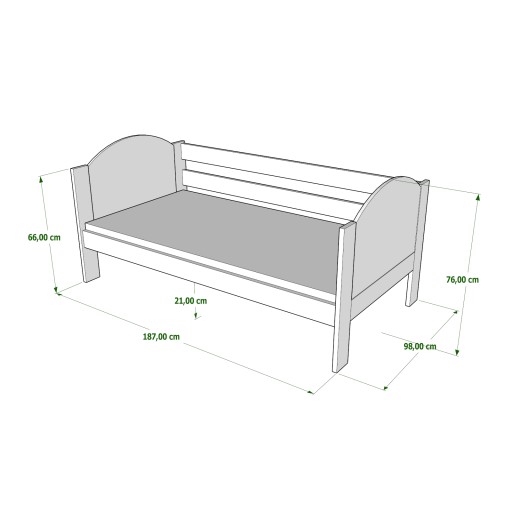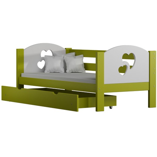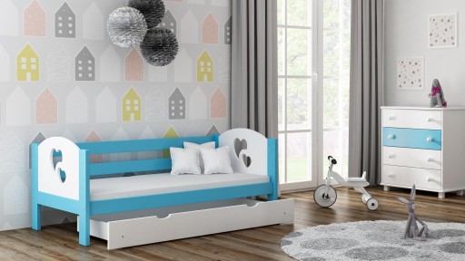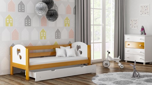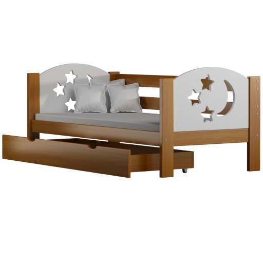 Łóżko WRÓBEL-F3 wykonane jest z wysokiej jakości drewna sosnowego z wstawką z płyty meblowej w zagłówkach. Wzór w serca lub gwiazdki, wycięty w łukowatych zagłówkach, nadaje całej konstrukcji lekkości i delikatności, a długa boczna barierka pełni funkcję ochronną.