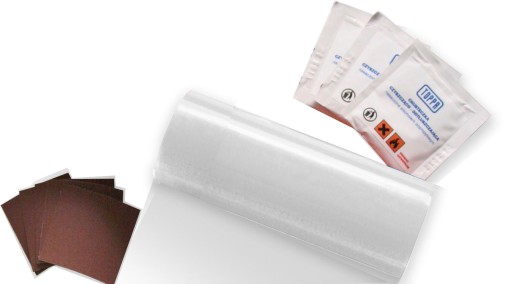 Doskonałym dodatkiem, który umożliwia zaklejanie dziur nawet w miejscach, gdzie zgrzewanie na ciepło nie dało by sobie rady, jest preparat gruntujący nasz klej. Wystarczy suchą powierzchnię przetrzeć specjalną chusteczką, najlepiej z góry na dół jednym pewnym ruchem. Na powierzchni pozostaje niewidoczna powłoka gruntująca, która zwiększa klejenie trudnych powierzchni.