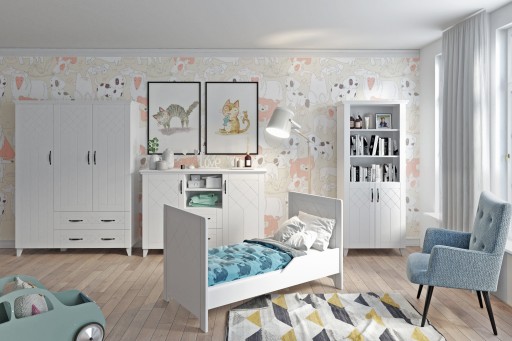 Zastosowana biel pozwoli na rozjaśnienie każdego pokoju dziecięcego, młodzieżowego, sypialnianego czy salonowego.