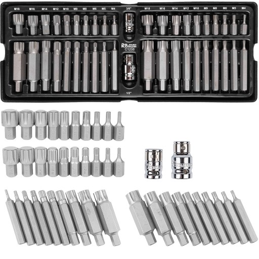 Zestaw zawierający 42 elementów bitów typu SPLINE/RIBE i nasadek umieszczonych we wkładzie do wózka warsztatowego typu A. Końcówki bit wykonane z mocnej stali narzędziowej S2, charakteryzującej się wysoką twardością i zwiększoną wytrzymałością na ścieranie. Nasadki zaś zostały wykonane ze stali chromowo-wanadowej (Cr-V) zastosowany chrom gwarantuje odporność stali na korozję, utlenianie, ścieranie i dużą wytrzymałość w wysokiej temperaturze, zaś dodatek wanadu również wpływa na odporność na działanie wysokich temperatur oraz nieuleganie deformacjom.Każdy element w zestawie ma przypisane i uporządkowane miejsce. Dodatkowo w zestawie załączana jest sztywna wkładka, która ułatwia utrzymanie wkładu w czystości, porządku a jednocześnie dodatkowo zabezpieczając zawartość.